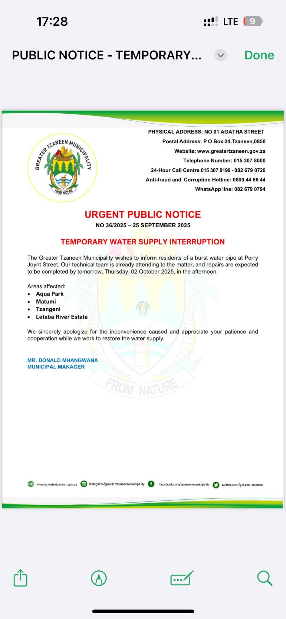 2025-09-18 - PUBLIC NOTICE - TEMPORARY CLOSURE OF GEORGE'S VALLEY WATER TREATMENT WORKS